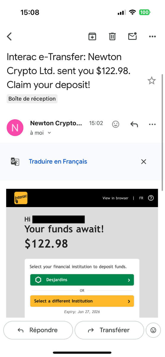 Newton te donne toutes les infos pour faire un virement Interac depuis ta banque.