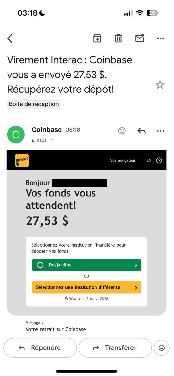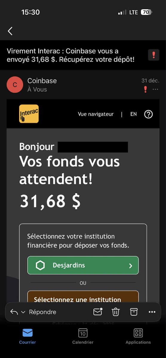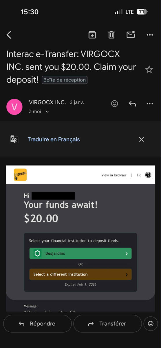 Tu reçois un virement Interac à accepter (selon ta banque).