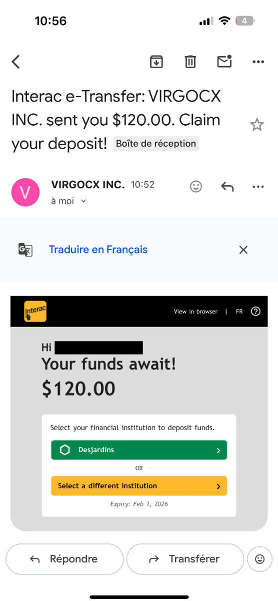 Quelques minutes (maximum 2h). Tu reçois un virement par courriel d’environ 123$ à accepter.